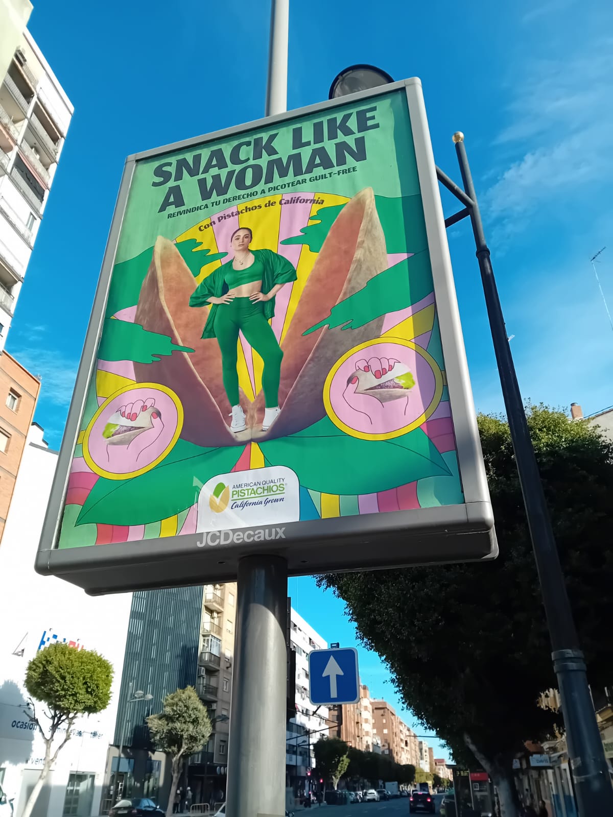 La campanya denunciada presenta el missatge principal “Snack like a woman” (en anglés, “Picoteja com una dona”), acompanyat de l’eslògan en castellà “Reivindica tu derecho a picotear guilt-free”. El cartell està presidit per la imatge d’una dona vestida de verd, segura, amb les mans a la cintura, situada davant d’una representació de dos pistatxos (festucs) oberts, en un disseny colorista i visualment cridaner.