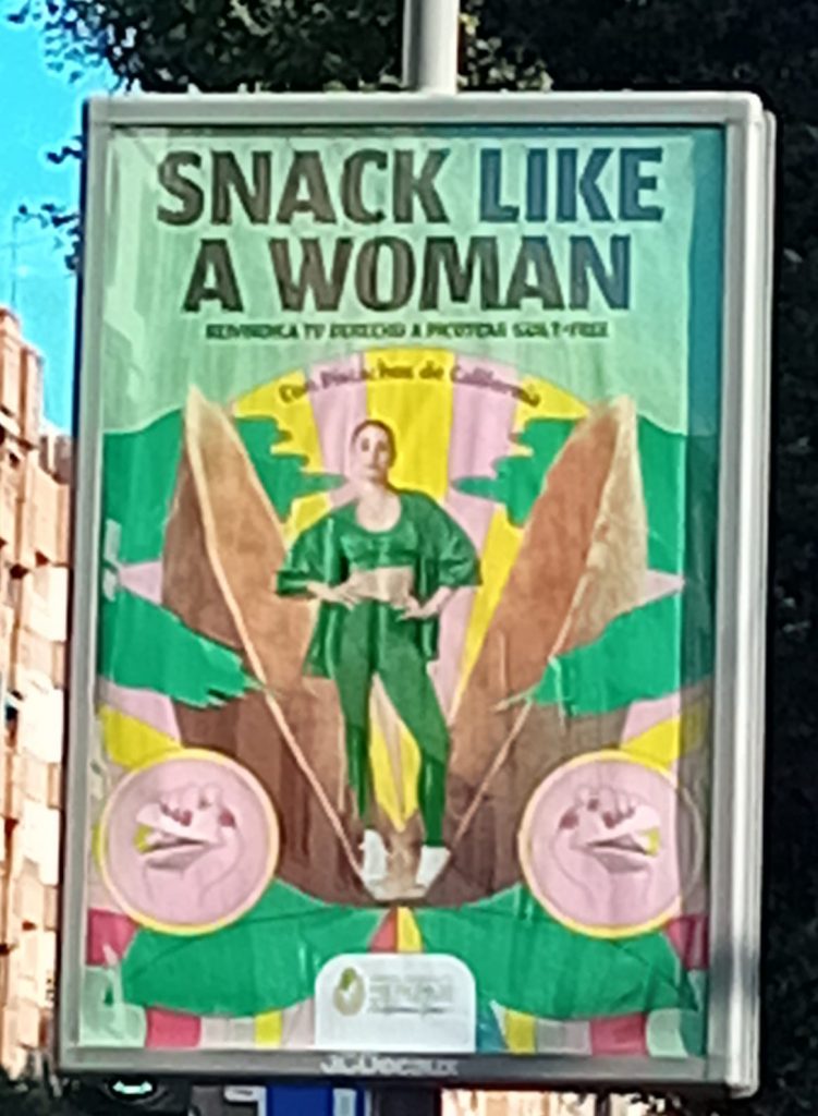 La figura femenina funciona com a eix central i recurs simbòlic per vendre el producte, malgrat no aportar informació rellevant sobre els pistatxos . L’expressió “Snack like a woman” no guarda relació amb el producte ni amb cap propietat nutricional, sinó que associa una acció quotidiana –menjar un snack– amb un comportament específic atribuït al gènere femení, reforçant així rols socials marcats.