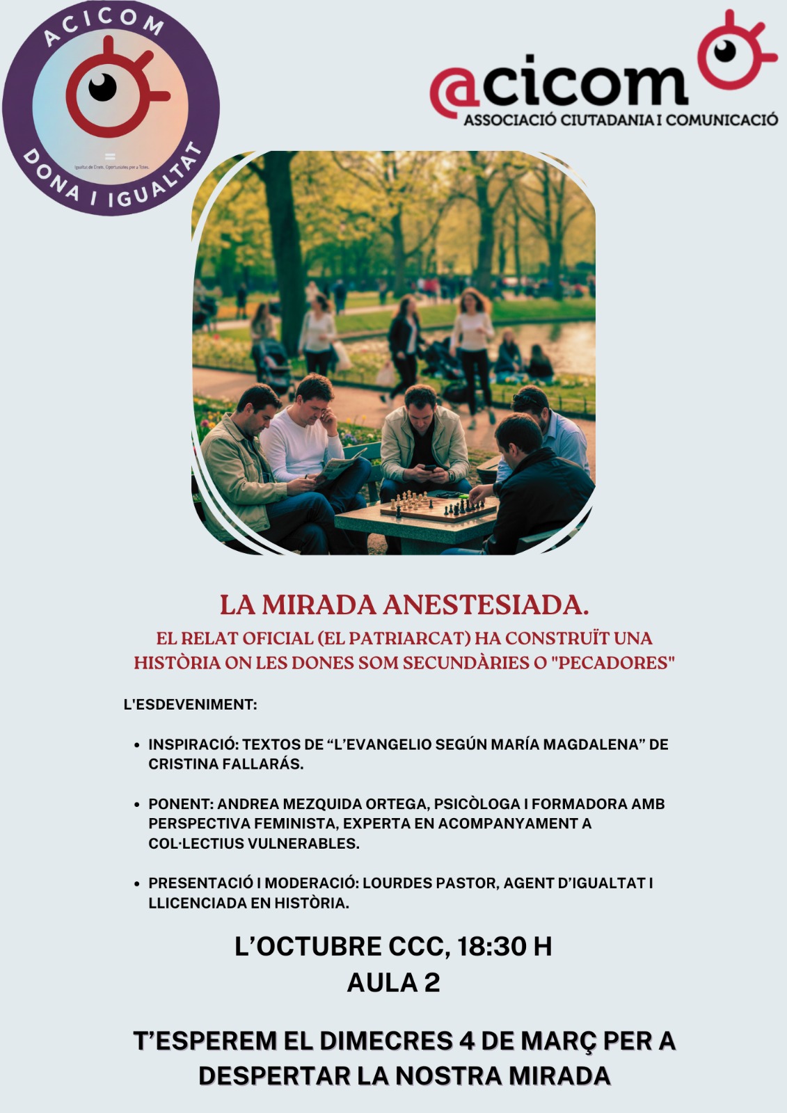 El dimecres 4 de març hem celebrat la sessió “La mirada anestesiada: la formalitat ens atorga un lloc, però la normalitat ens continua invisibilitzant”, una trobada organitzada per ACICOM en el context del 8M, coordinada per Lules Pastor vocal de l’Àrea d’Igualtat, que va reunir dones de diferents generacions en un espai de diàleg, reflexió i escolta compartida.