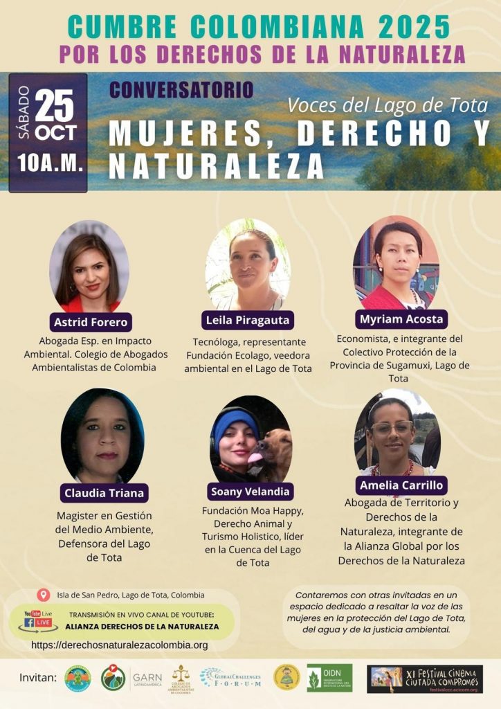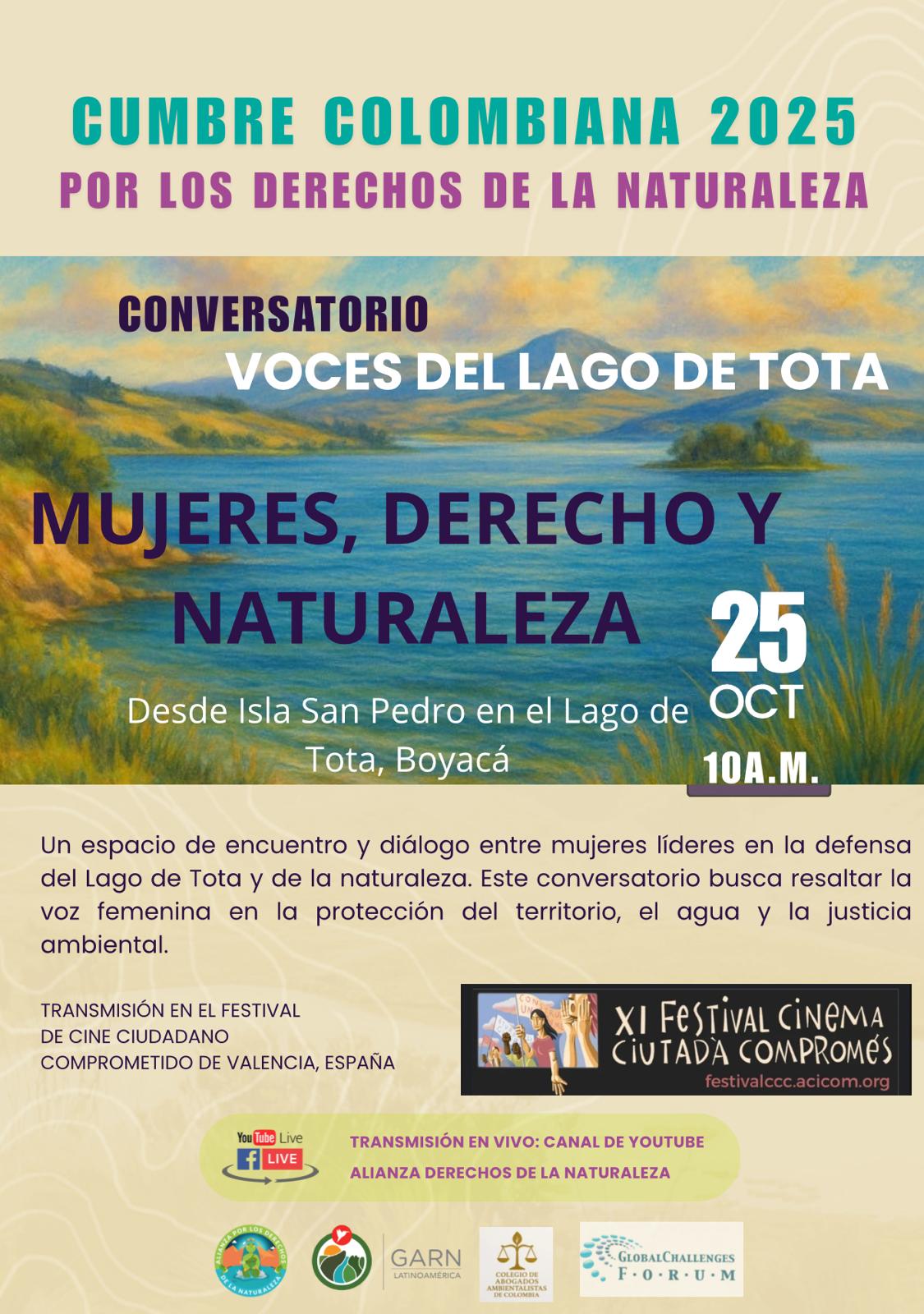 La Cumbre por los Derechos de la Naturaleza Colombia 2025 y el Festival de Cine del ciudadano comprometido en Valencia España, invitan a un espacio de diálogo entre mujeres líderes locales del Lago de Tota, y otras regiones, abogadas ambientalistas, con transmisión en vivo para el Festival Internacional de Cine Ciudadano Comprometido de Valencia, España.