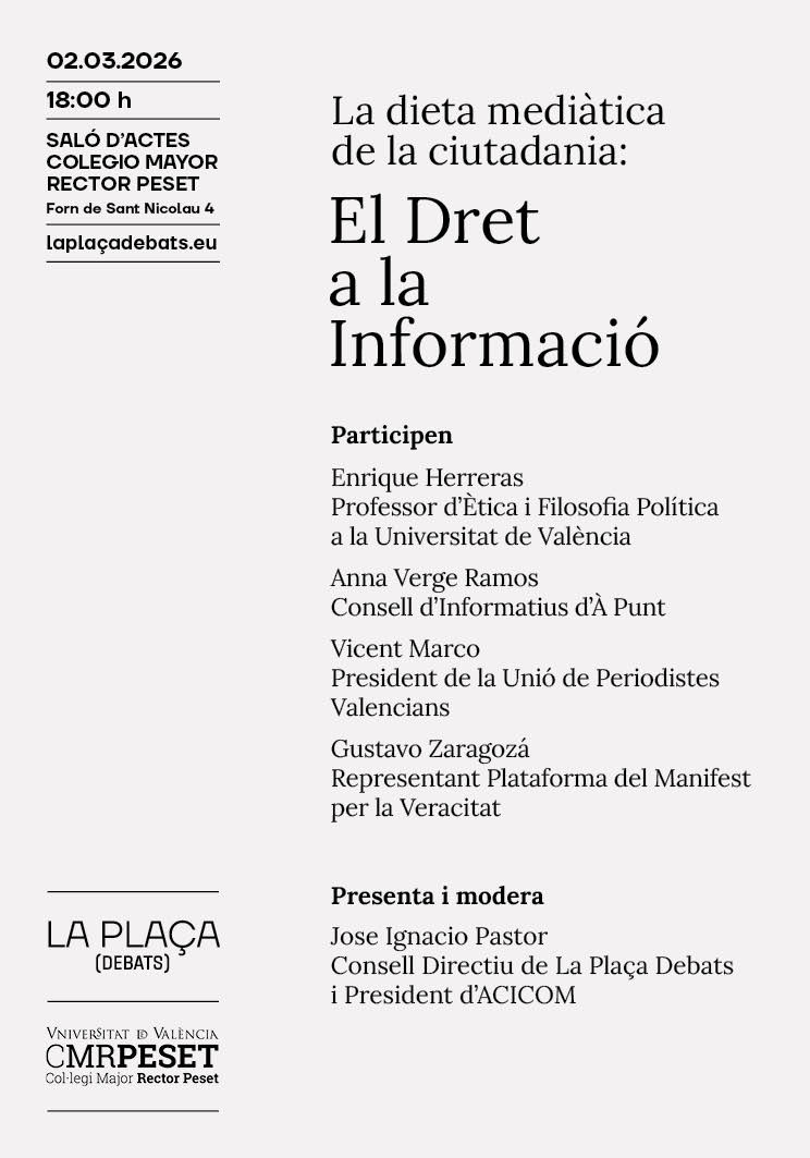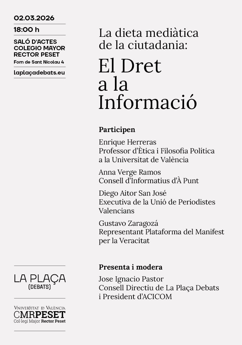La dieta mediàtica de la ciutadania: El Dret a la Informació, en La Plaça Debats, dia 2/3/2026 a les 18h. Col·legi Major Rector Peset, València.
