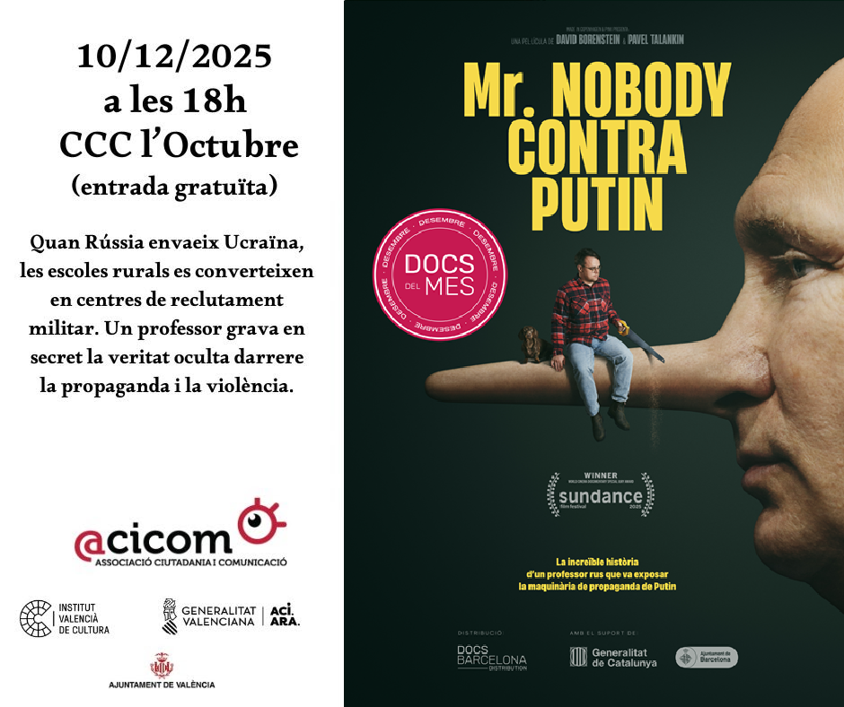 ACICOM i ACPV, amb la col·laboració de Docs Barcelona,  organitzem  una sessió del cineclub projectant el documental, Mr. Nobody contra Putin.