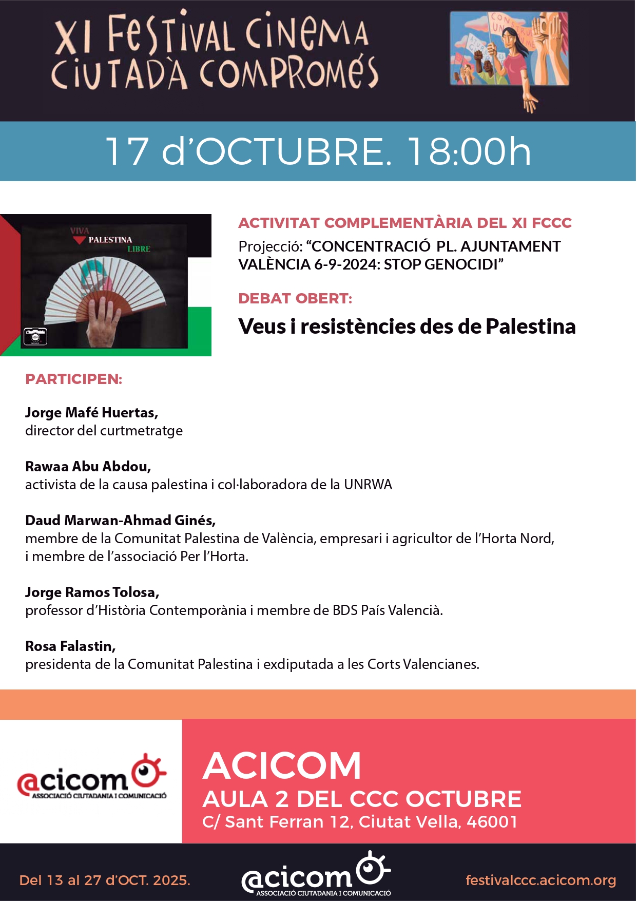 En el marc de l’XI Festival de l’Audiovisual Ciutadà Compromés (Festival ACC), ACICOM presenta la jornada “Veus i resistències des de Palestina”, una activitat que combina l’audiovisual i el debat per donar visibilitat a la lluita, la cultura i la dignitat del poble palestí.